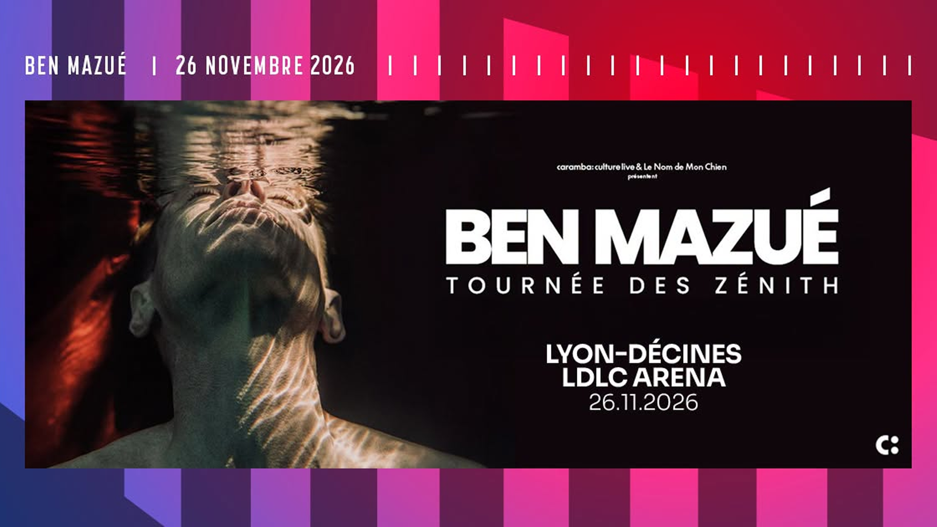 Après une tournée triomphale de 30 théâtres et 20 Zénith complets, Ben Mazué annonce une nouvelle série de concerts pour faire durer l’émotion. Place aux prolongations à la LDLC Arena le 26 novembre 2026 !
