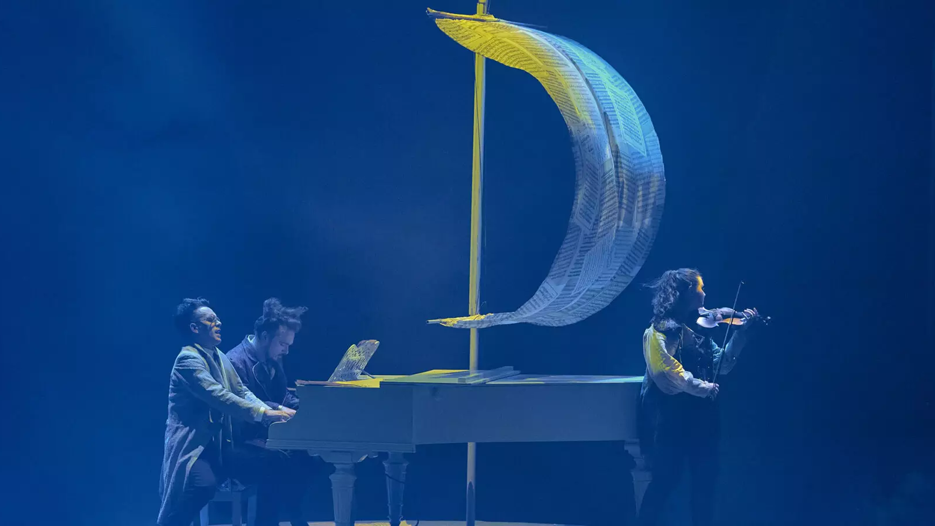 Pour cette nouvelle aventure, Mathias et Julien Cadez ouvrent les portes de leur univers à un troisième personnage, une violoniste aussi redoutable que fascinante, incarnée par Anna Gagneur. Comédie, magie et musique fusionnent dans un spectacle sans parole et unique en son genre. Alors qu’une tempête se prépare, deux pianistes se retrouvent face à une mystérieuse violoniste qui, contrainte de trouver refuge chez eux, bouleverse leur quotidien. L’étrangère souffle un vent nouveau, mettant à rude épreuve les deux compères qui rivalisent de virtuosité et de ruse pour dompter la vague qui s’annonce. Mais qui, des pianistes et de la violoniste, parviendra à imposer son tempo final ? Entre désaccords savoureux et instants de pure poésie, cet improbable trio nous emporte dans une folle épopée, aux confins de la musique et de l’imaginaire.