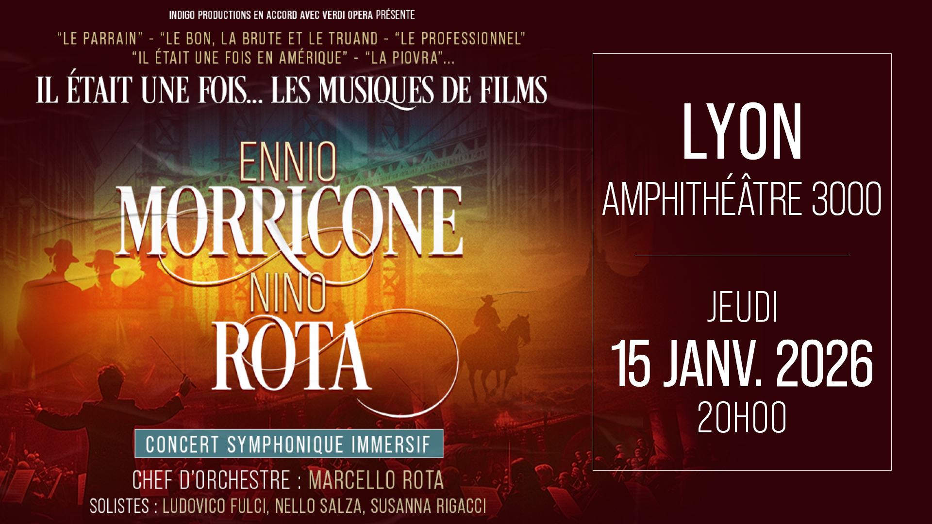 Voyage sensoriel unique avec les musiques de Morricone et Rota, dirigé par Marcello Rota. À ne pas manquer à L'Amphi 3000.