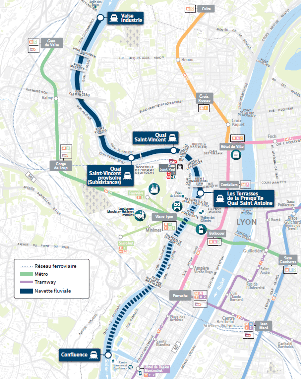 La ligne fluviale s’étendra sur 6,2 km et comptera quatre haltes : un terminus dans le quartier de l’Industrie (9e arrondissement), une station quai Saint-Vincent en bas des pentes de la Croix-Rousse, une autre quai Saint-Antoine (face aux nouvelles Terrasses de la Presqu’île) et une dernière halte à Confluence. En heure de pointe, un bateau passera toutes les 15 minutes. Le trajet entre Vaise et la Presqu’île durera entre 15 et 20 minutes.