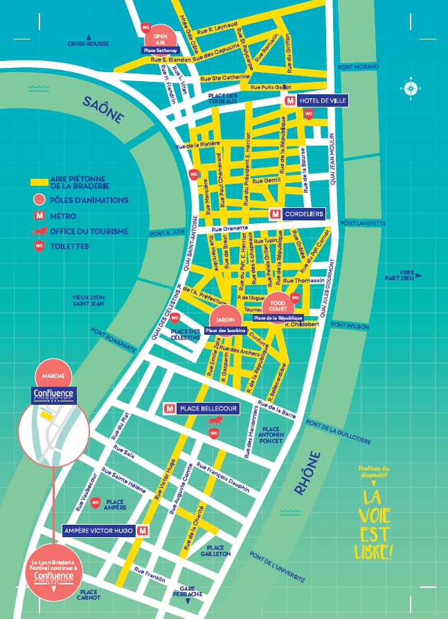 La Presqu’île sera totalement piétonnisée, de la place Bellecour à la rue Victor-Hugo en passant par la rue de la République et le centre commercial Confluence. Plus de 20 000 visiteurs sont attendus pour cette grande fête du commerce local.